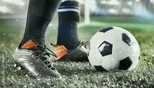 Soccerball being Kicked by Player - Football Game - Ball being Kicked by Soccerplayer wearing Kicks - Ball right before Goal or Impact - Special Effects in Stadium - Start of the Sports Game