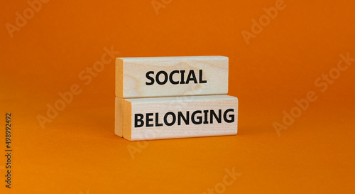 Social belonging symbol. Wooden blocks with concept words Social belonging on beautiful orange background. Business political social belonging concept. Copy space.