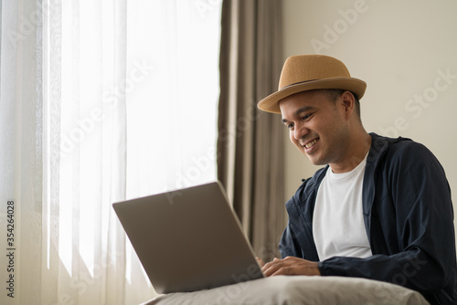 Social distancing concept. Asian handsome man work from home with laptop. Young Casual businessman aged around 30 using laptop for his work on the bed.