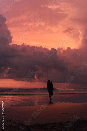 social distancing on the beach , pink and orange amazing cloudy sky , beautiful sunset , Bali Indonesia , solo outdoor walking