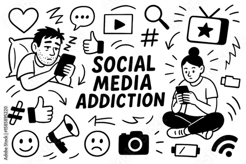 Social Media Addiction Doodle Set – Smartphone Dependency, Anxiety, Depression, Notifications, and Digital Overuse – Black and White Comic Style – Transparent Background