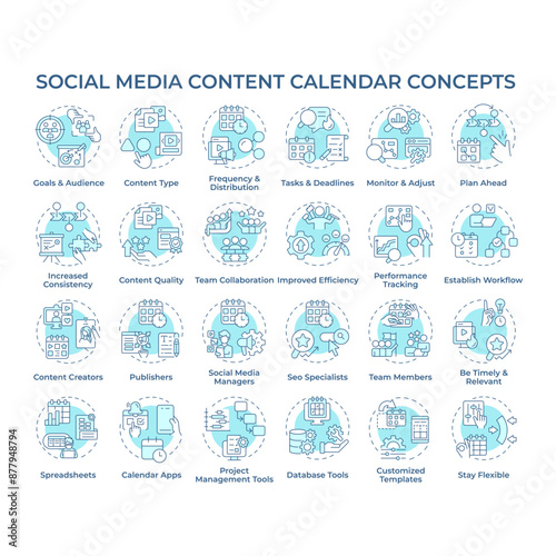 Social media content calendar soft blue concept icons. Implementing effective social media strategies. Project management. Icon pack. Vector images. Round shape illustrations. Abstract idea