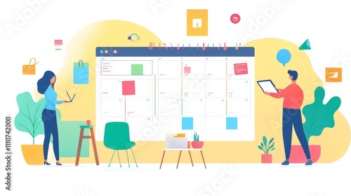 Social media content planning, scheduling layouts, colorful calendar setup on screen