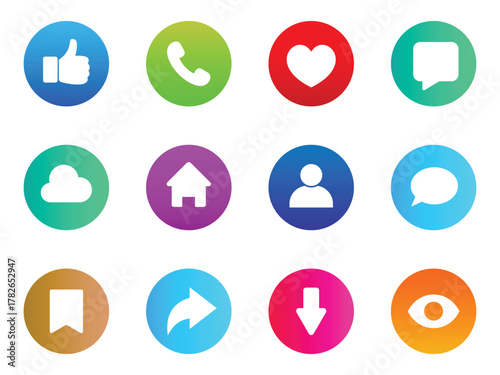 Social media engagement and communication symbols heart, thumb, user, communication, share, drive, home, eye, call icons