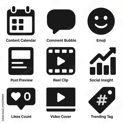 Social Media Icons. Solid style icons of social content creation: content calendar, comment bubble, emoji icon, post preview, reel