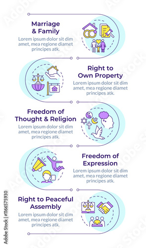 Socioeconomical rights infographic vertical sequence. Social movement, thought freedom. Visualization infochart with 5 steps. Circles workflow. Montserrat SemiBold, Lato Regular fonts used