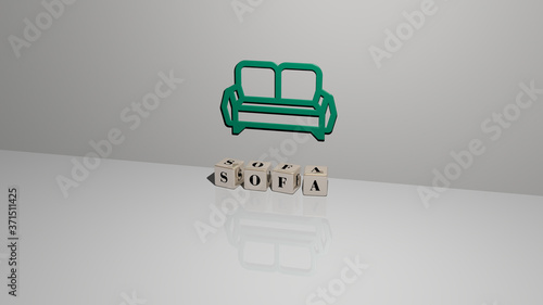 sofa text of cubic dice letters on the floor and 3D icon on the wall - 3D illustration for home and room