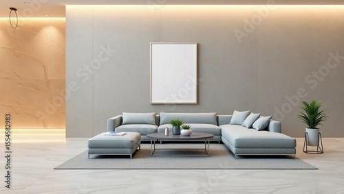 sofa, wooden frame, white walls, minimalist decor, modern interior design, natural lighting, empty frame, wooden floor, textured rug, neutral color palette, clean lines, simple elegance