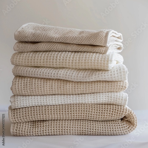 Soft and textured kitchen towels neatly stacked in natural colors for home decor or cooking tasks