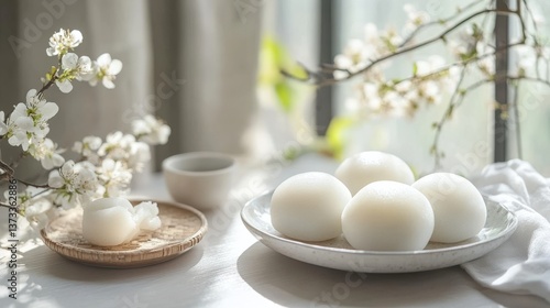 Soft Backlit Mochi Dessert in Minimal Tones with Floral Accent
