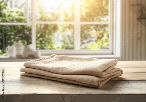 Soft Beige Kitchen Towels Folded Neatly on a Wooden Table with Bright Natural Light Streaming Through a Window Surrounded by Greenery in a Cozy Home Setting
