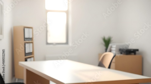 Soft Blurred Minimal Office Interior with Sunlit Desk – Suitable for Presentation Backgrounds and Creative Templates