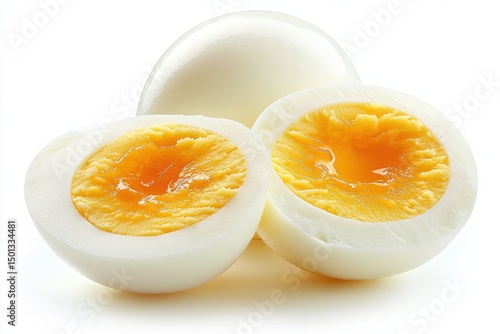 Soft boiled eggs cut in half revealing yellow yolks on a clean white background for culinary presentations or recipes