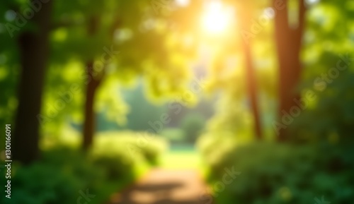 Soft bokeh effect of sunlit garden trees with golden light filtering through leaves