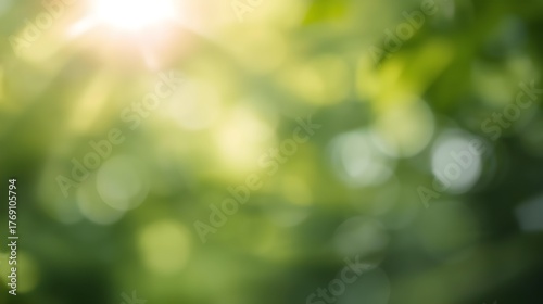 Soft bokeh lights and sun flare through green leaves in nature