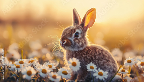 soft bunny surrounded by daisies and sunshine, evoking sense of warmth and tranquility in beautiful natural setting