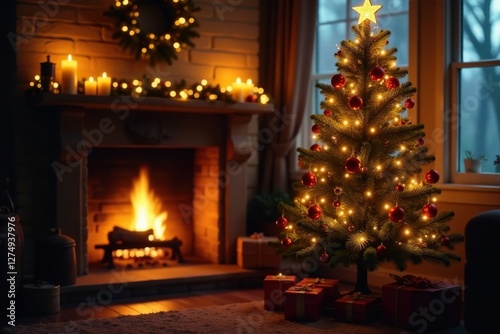 Soft candlelight illuminates a Christmas tree, fireplace, golden