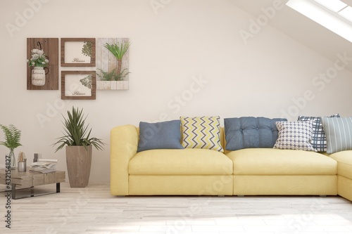 Soft color living room with sofa. Scandinavian interior design. 3D illustration