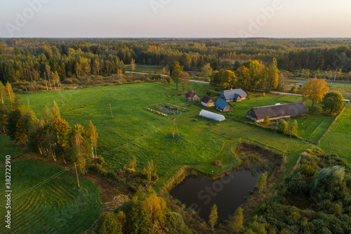 Soft colourful sunset light over the forest and countryside farm in distance.