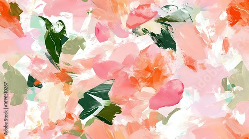 Soft coral and pink abstract floral pattern with emerald green leaves creates romantic mood, watercolor style brush strokes on light background for fabric design.