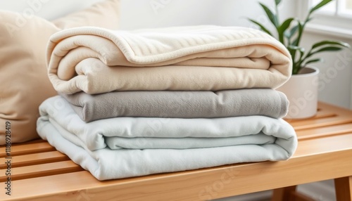 Soft Cozy Fleece Blankets Stacked on Wooden Bench Neutral Colors Home Decor
