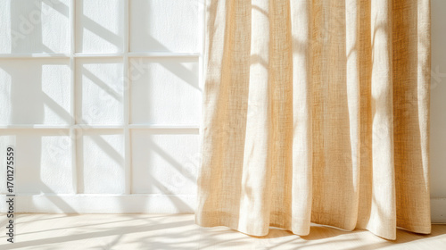 Soft curtain swaying in sunlight, casting gentle shadows on white wall