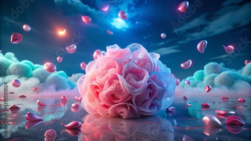 Soft Feminine Bath Loofah & Petals with Neon Sky - Stock Photo