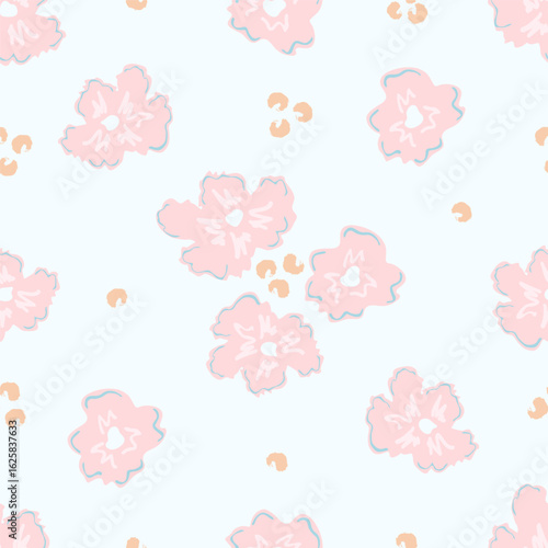 Soft floral vector seamless pattern. Delicate pink flowers on light blue background. For fabric prints, textile products, summer, children's clothing.