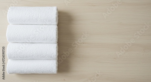 Soft, fluffy white towels neatly stacked on a warm, inviting wooden surface