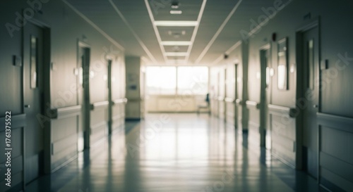 Soft Focus Hospital Interior Long Hallway Perspective with Clinic Doors