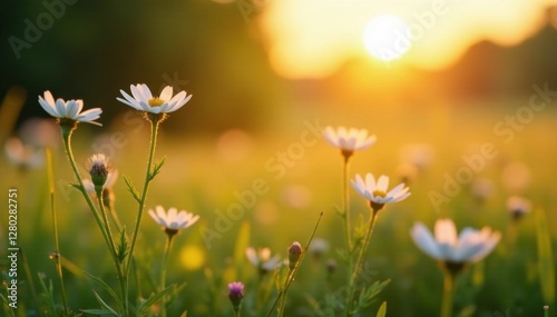 Soft focus meadow bathed in sunset, delicate wildflowers swaying gently , yellow, backdrop, floral