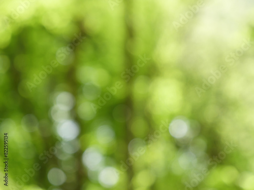 Soft focus on green leaves and branches, creating a bokeh effect in a sun-dappled forest during spring.