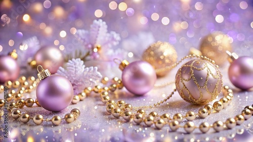 Soft focus pastel purple background adorned with delicate golden ornaments, glittering beads, and subtle festive decorations awaiting customization.
