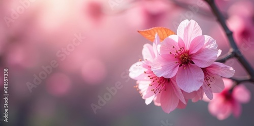 Soft focus pink cherry blossoms, blurred background, branch, spring, vibrant