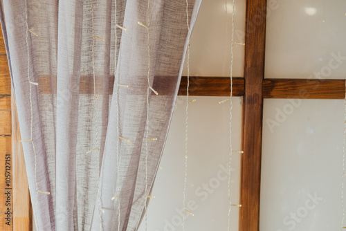 Soft gray curtain drapes beside wooden framed wall in a cozy indoor space