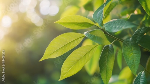 Soft green leaves gently illuminated by sunlight with a blurred natural background creating a tranquil botanical atmosphere.