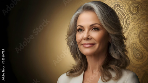 Soft Light of Elegance: A Woman in Her Forties Under Softbox Light, Refreshed Skin Contrasts with a Golden Backdrop of Intricate Paisley Designs