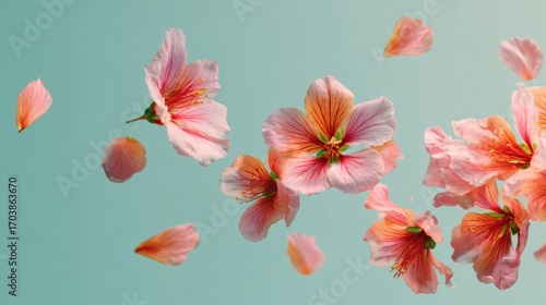 Soft, light pink hibiscus flowers are gracefully scattered against a tranquil blue background, creating a serene and joyful atmosphere. Petals drift away gently in a harmonious display.