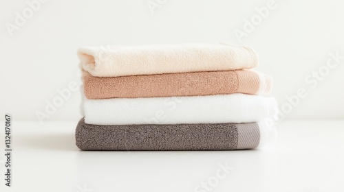 Soft, neatly stacked towels in neutral colors arranged on a clean, minimalistic surface for a calming home atmosphere