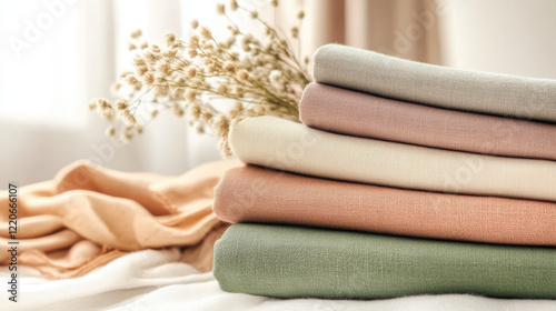 Soft pastel colored fabric neatly folded in serene arrangement, featuring shades of pale sage green, muted taupe, cream, and peach, with dried flowers in background