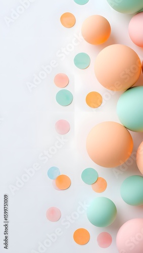 Soft pastel Easter eggs and confetti arranged diagonally on a white background, creating a festive and celebratory mood.