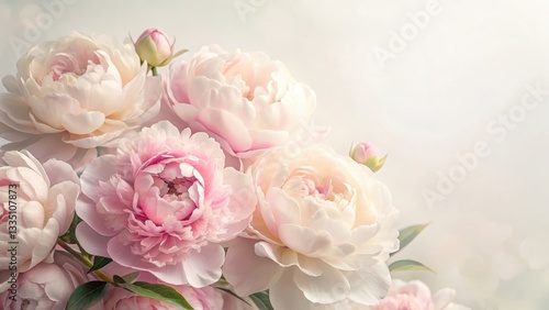 Soft pastel pink peony flowers on a delicate white background, subtle color palette, elegance