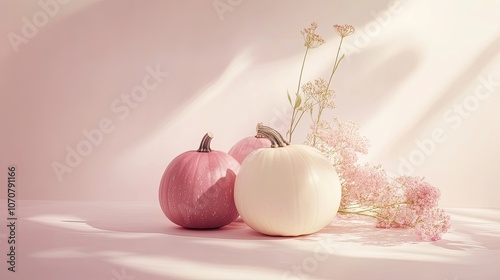 Soft pastel pumpkins and delicate flowers on a light background. Minimalistic autumn banner with generous copy space.