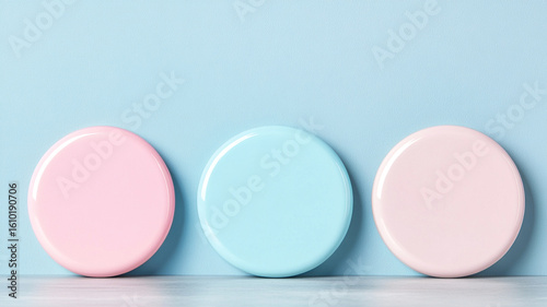 Soft pastel round badges in pink and blue colors arranged on light blue surface creating calm and gentle mood