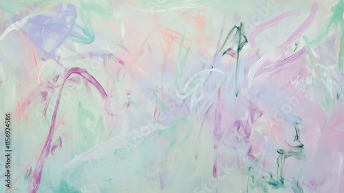 Soft pastel shades of pink, lavender, and mint green with smeared strokes, subtle paint sprays, and delicate streaks for a calming artistic vibe