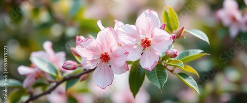 Soft pastel watercolor blooms, delicate leaves, blurred bokeh background, petal, blossom