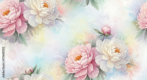 Soft pastel watercolor peonies with delicate petals and gentle green leaves, a beautiful floral pattern