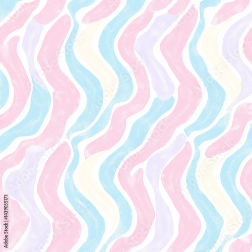 Soft pastel waves create calming and playful pattern, featuring gentle curves pink, blue, and yellow hues. This design evokes sense of tranquility and joy, perfect for various creative projects