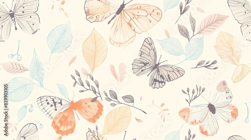 Soft pastel-colored butterflies and leaves, hand-drawn seamless floral pattern