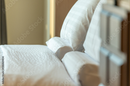 Soft pillows and white towel on clean white bed. Pillows bed with bedding sheets in bedroom. Bed sheets and pillows messed. Hotel, resort or home can relax on bed for deep sleep.